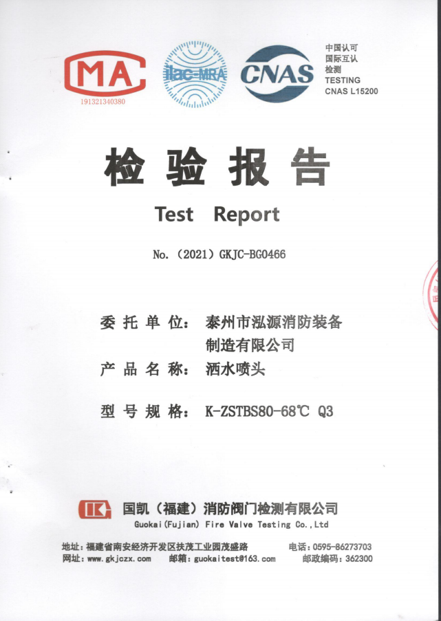 啟真灑水噴頭ZSTDY80-68°C Q3檢驗(yàn)報(bào)告